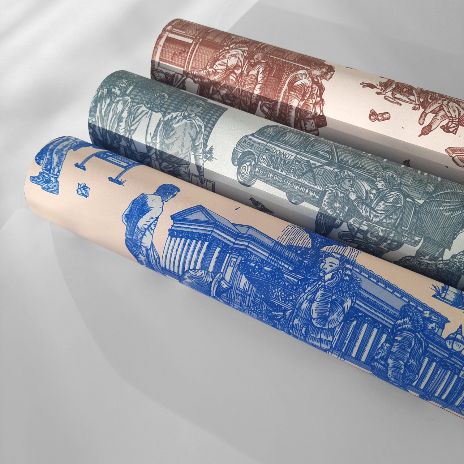 Combining classic designs and an uncanny, tongue in cheek, humorous eye on the every day. Catherine's recently launched patterned wallpaper is based on the toile de jouy template and features eleven scenes, characteristic of quirky aspects of Scouse life, framed against a backdrop of Liverpool buildings. In addition, each design is linked to charitable donations, giving back to the community in a meaningful way.